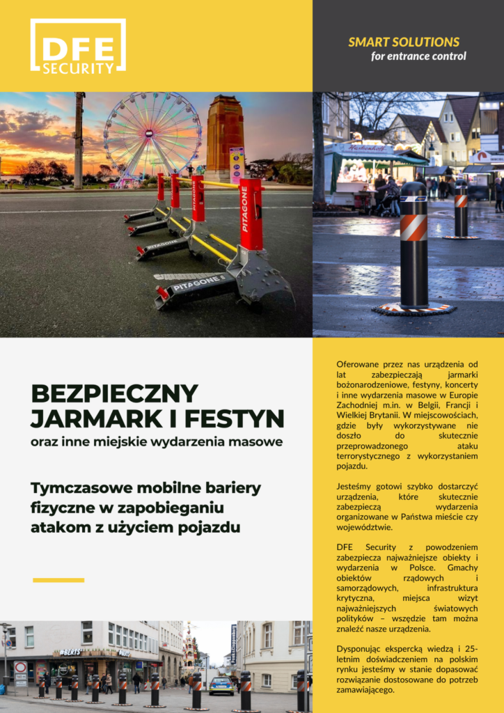 Oferowane przez nas urządzenia od lat zabezpieczają jarmarki bożonarodzeniowe, festyny, koncerty i inne wydarzenia masowe w Europie Zachodniej m.in. w Belgii, Francji i Wielkiej Brytanii. W miejscowościach, gdzie były wykorzystywane nie doszło do skutecznie przeprowadzonego ataku terrorystycznego z wykorzystaniem pojazdu.