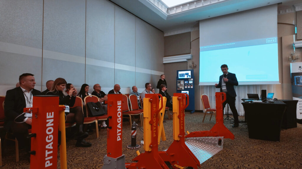 Mieliśmy okazję przekazywać wiedzę również ze sceny. Jarosław Jaźwinski, CEO DFE Security, opowiadał o tym, w jaki sposób zabezpieczyć infrastrukturę krytyczną i obiekty użyteczności publicznej przed atakami z użyciem nieautoryzowanych pojazdów, zaś Maciej Medyński – Country Manager DFE Security – prowadził praktyczne warsztaty na temat mobilnych, drogowych zapór antyterrorystycznych. Uczestnicy warsztatów musieli samodzielnie rozstawić zapory i rozmieścić je w poprawnej odlegości – w ten sposób uczyliśmy, co jest najistotniejsze przy wykorzystywaniu tego typu produktów. Jesteśmy przekonani, że słuchacze wykładu i uczestnicy warsztatów wyszli z nich ze zwiększonym poczuciem świadomości i bogatsi w praktyczną wiedzę.